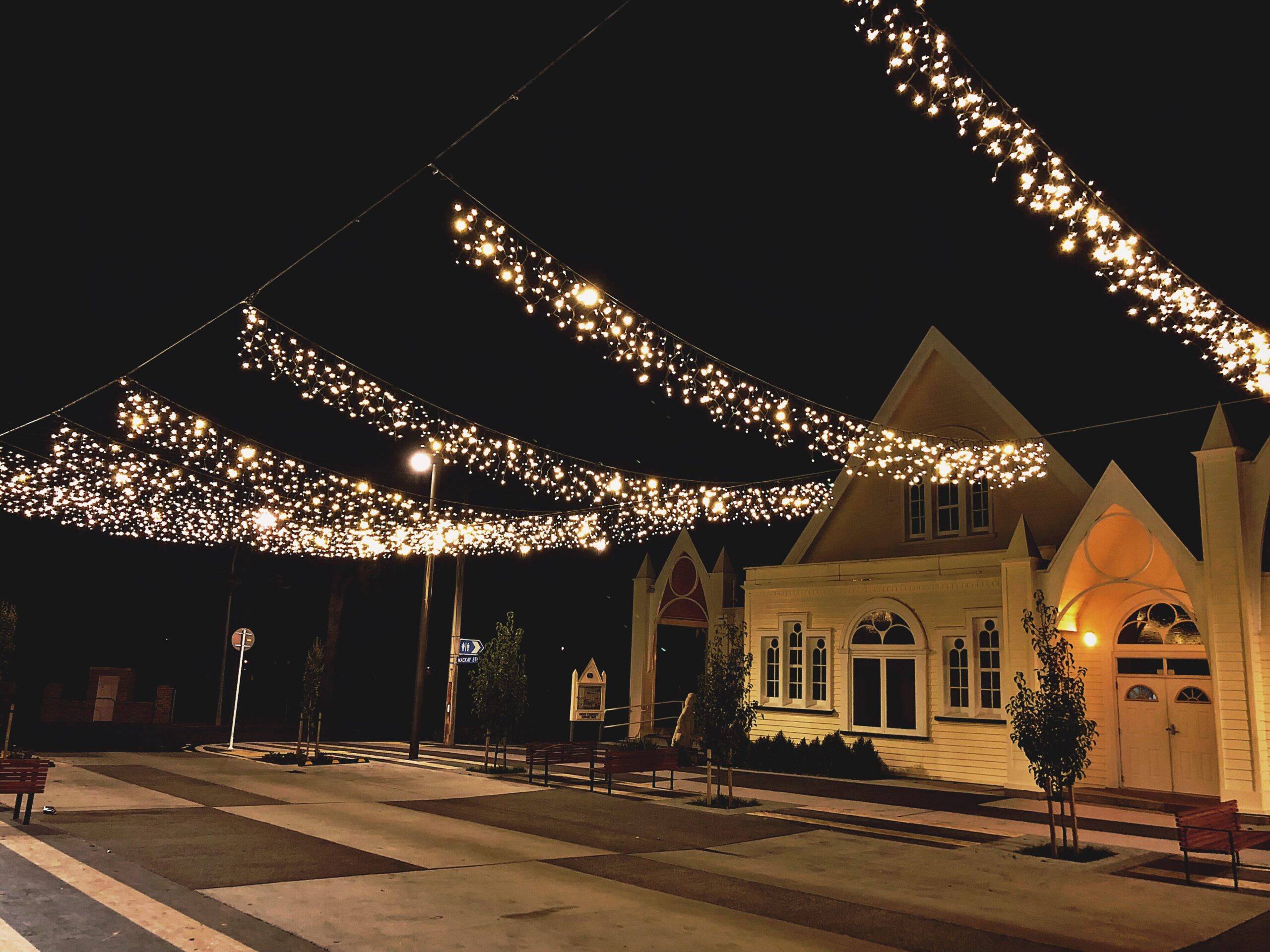 Further, as catenary lighting can be installed via poles or onto a pre-existing structure it allows us to create minimal disruption to the environment. This is a huge benefit for smaller spaces or environments where there is a large number of people or objects filling the space. When we think of Catenary lighting we know it will be installed from an overhead perspective, this allows maximum usage of the environment when there is a high volume of foot traffic. Leading to an increase of return for communities and an overall safer environment at night.