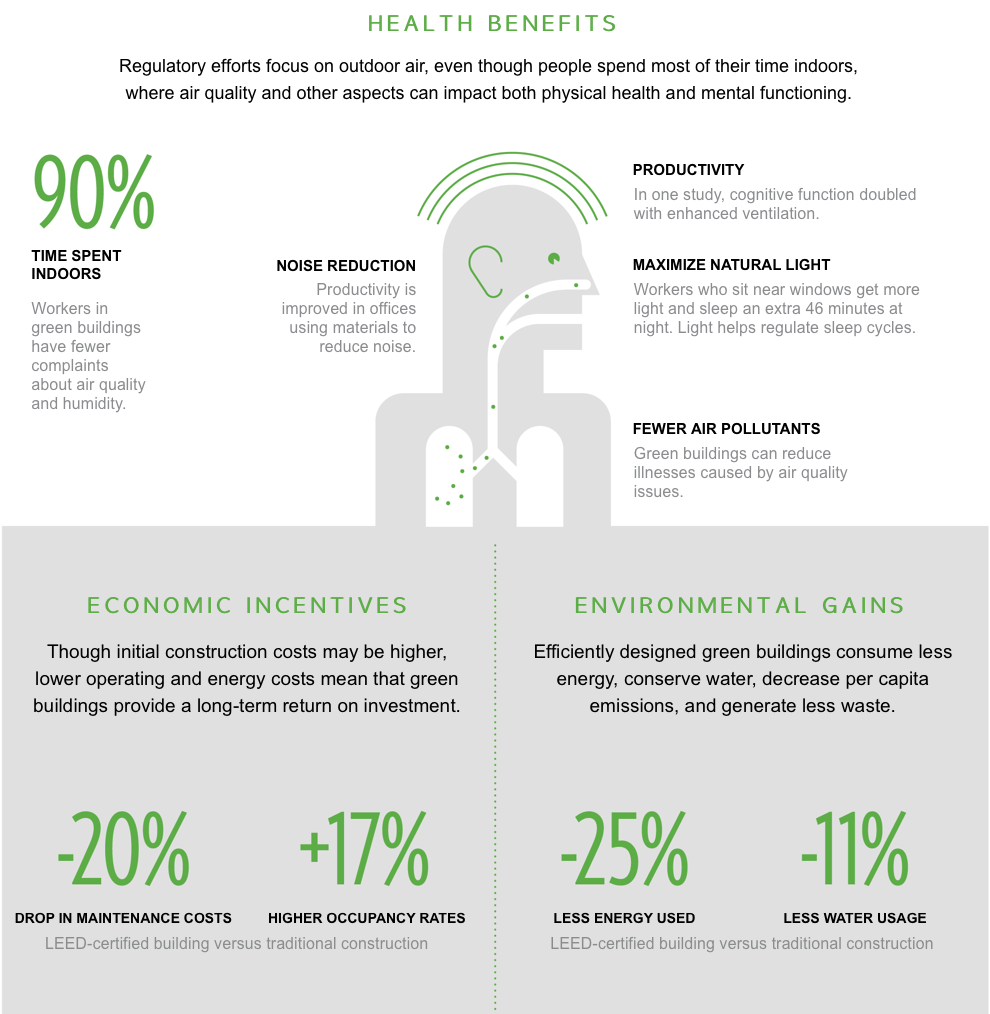 Cities contribute to 70% of greenhouse gas emissions. With 30% being generated from buildings. A study was conducted and found that compared to traditional construction, green buildings could reduce emissions by 34%.