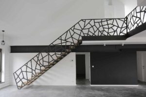 This balustrade appears to be created from flat bar mild steel, with a black powder coat finish. Whether matched with a soft timber (similar to the image) for a contemporary aesthetic or teamed with an industrial-style charcoal chequer plate or even concrete, this design is so flexible and a real standout.