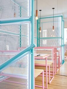The first inspiration concept features stainless steel tube framework, which has been powder coated in a retro blue and pink, then filled in with white mesh. We love the pops of colour in this design. At SRS we can offer metals to be powder coated in any Dulux range – with an offering of over 900 colours, we are sure to find one that suits your vision. Imagine this retro, funky look to awaken your office meeting space, kitchen or as partitions around employees workspaces.