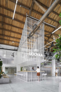 Our second image (below) features a large scale stainless steel frame-work powder coated white, matched with a white mesh infill. This large scale design is sure to create a statement within your office or retail area.