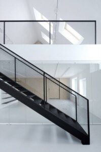 If minimalist design appeals more, then this all-black powder coated flat bar balustrade in the third image (below), might just grab your attention. This was infilled using a black mesh. This balustrade is really similar to one we created one in Auckland’s historic Mason Brothers Building – seen up close in the fourth image.