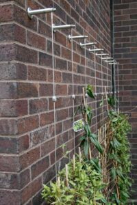 Trellis systems come in many shapes and sizes, these are divided into two main groups. Single Line systems consisting of wires being run horizontally or vertically to support twining pants or scramblers. The second group being crosshatch systems. This is where wires intertwine over each other to allow more support and coverage for scrambling or climbing plants. An easy solution to create this type of system is tensile mesh.