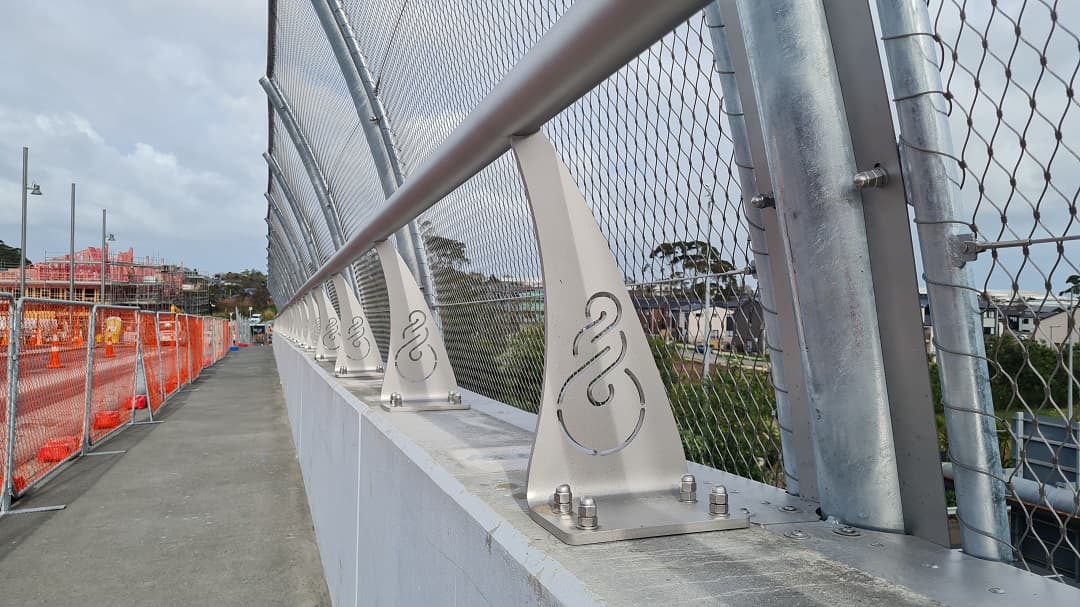 - Laser-cut Maori motif ‘pikorua’ into 316 stainless steel handrail bracket.