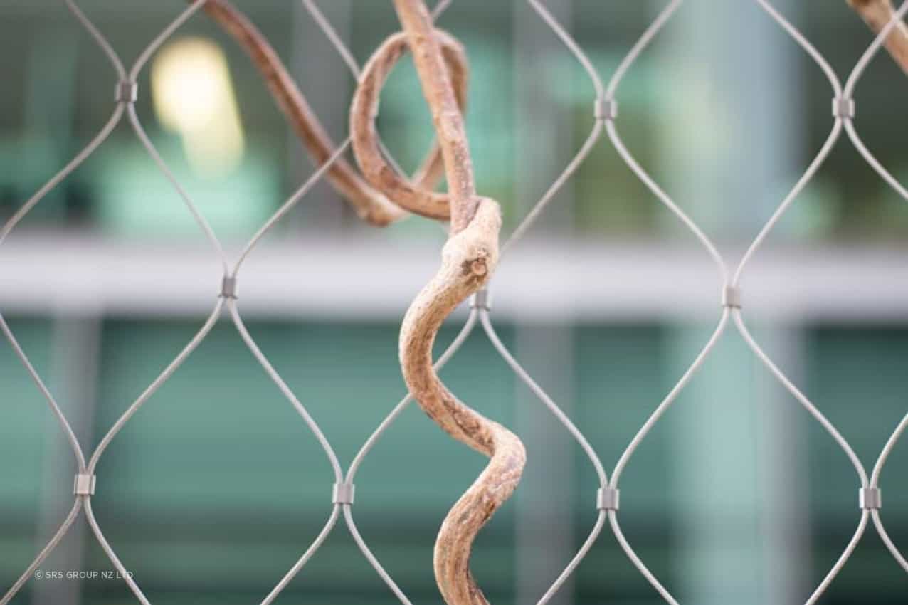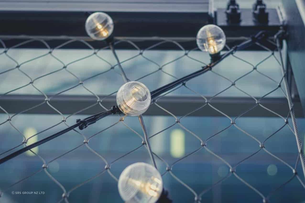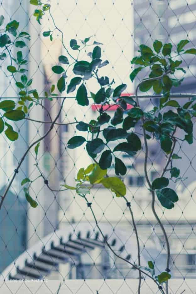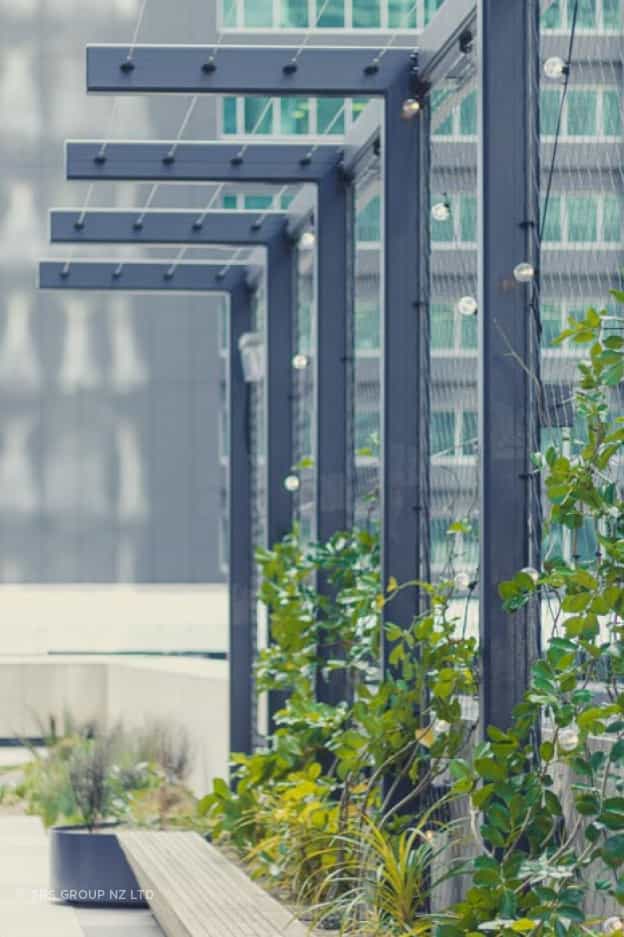 SRS Group installed the tensile mesh panels along this outdoor feature on Level 3 of the PWC Building, located above Commercial Bay, Auckland.